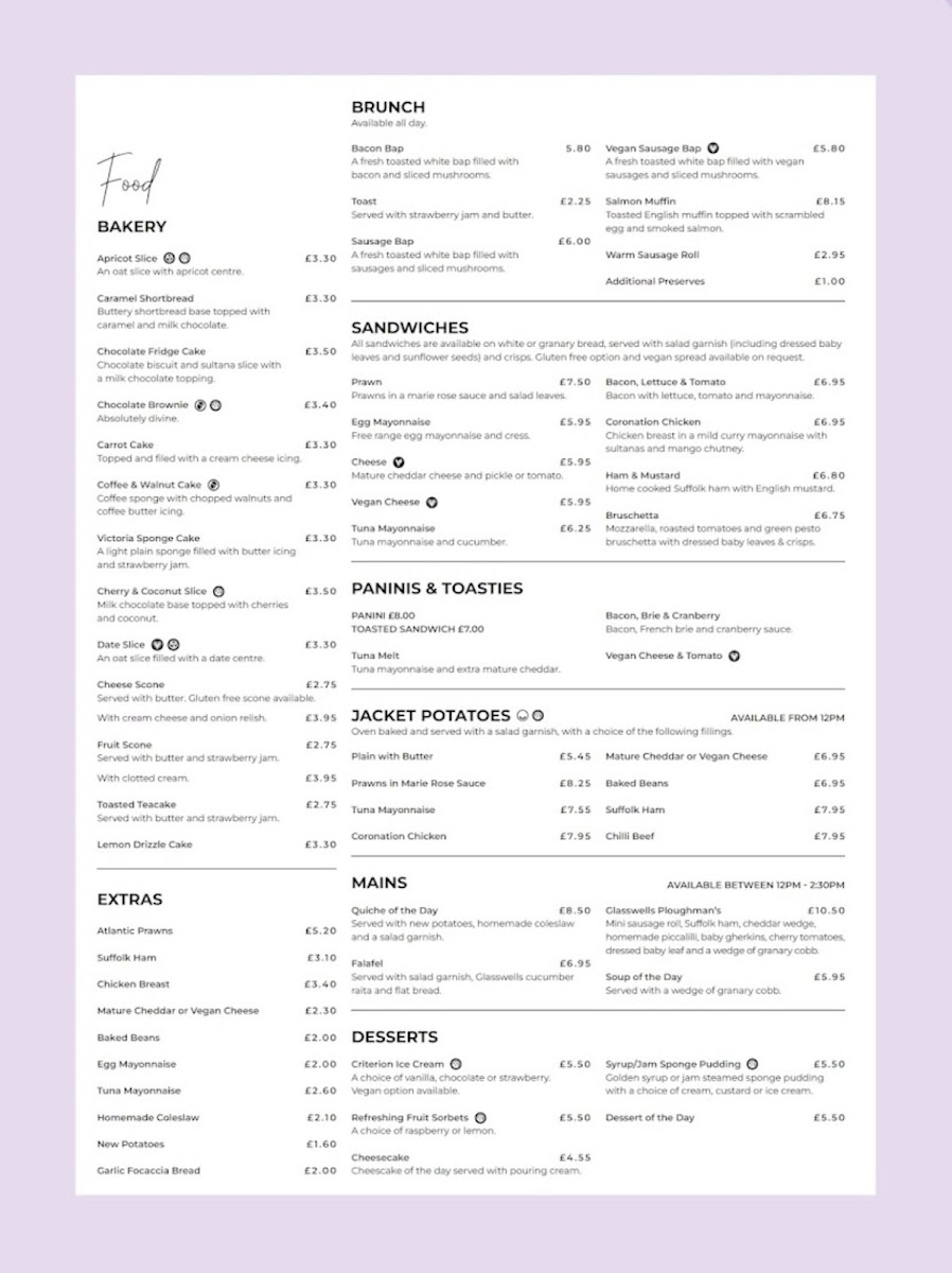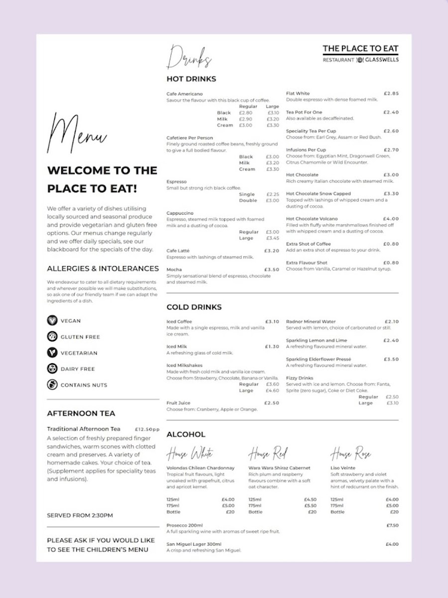The Place To Eat @ Glasswells Ipswich Menu